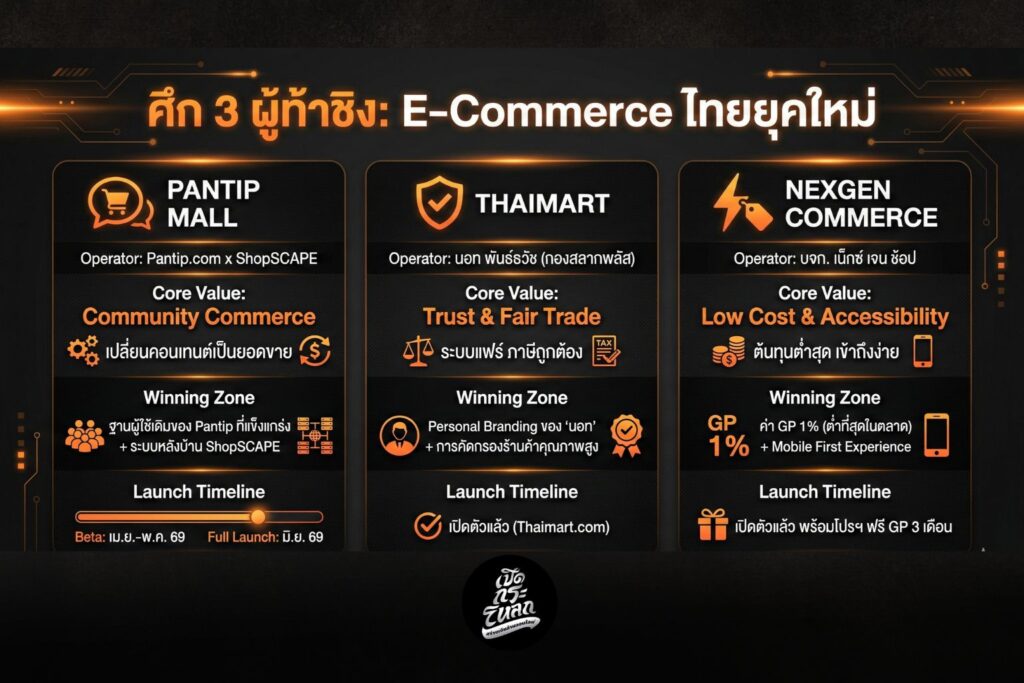 คำถามสำคัญคือ “ใครจะมารับไม้ต่อ?” ในขณะที่ผู้ประกอบการไทยกำลังโหยหา “ทางรอด” จากค่า GP ที่สูงลิ่วของแพลตฟอร์มต่างชาติ การปรากฏตัวของ Pantip Mall, Thaimart และ NexGen Commerce จึงไม่ใช่แค่ทางเลือก แต่คือเดิมพันครั้งใหม่ของ “Thai e-Commerce Sovereignty” (เอกราชทางการค้าออนไลน์ของไทย)