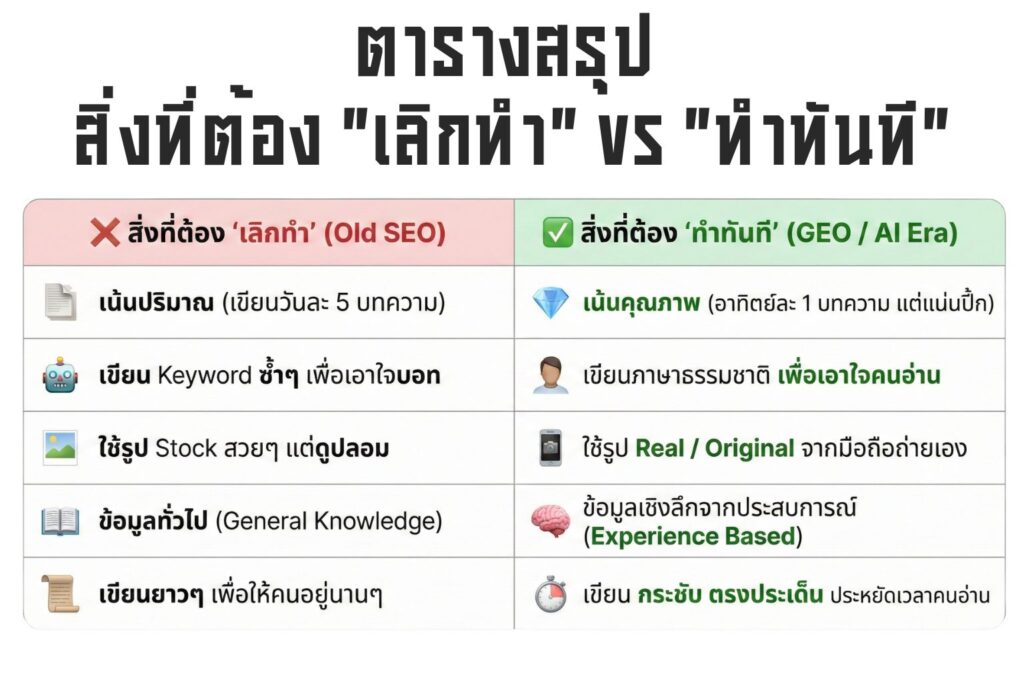 Google และ AI ให้ความสำคัญกับ E-E-A-T (Experience & Expertise) มากๆ คือเขาอยากรู้ว่าคนเขียนรู้จริงไหม